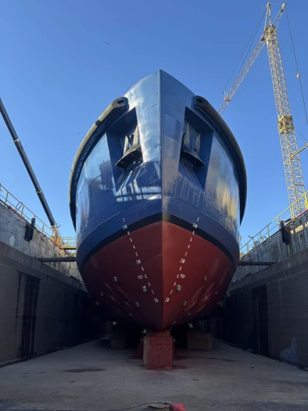 The hull received a new coating of Self-Polishing Copolymer (SPC) paint, which has greater resistance to fouling than conventional anti-fouling paints. This coating influences navigation performance because it reduces the demand for cleaning. The water intake structures, thruster tunnels, and the waterjet also received a finish with specialized paint.