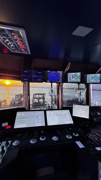 One of the new features is the launch system for the diving bell, which fully submerges while fixed to the A-frame, without using the steel cable. By cutting the transversal "swing" of the bell during projection, the launch becomes safer than conventional systems. The other novelty was the replacement of the positioning system with a Kongsberg system. The change aims for more efficiency and user proximity, not only because of the manufacturer's market leadership but also due to the officers' familiarity with the support, which ensures greater precision and reliability in offshore operations.